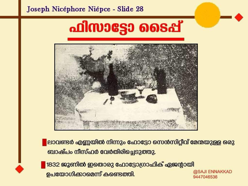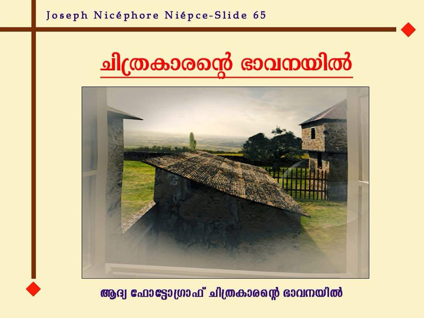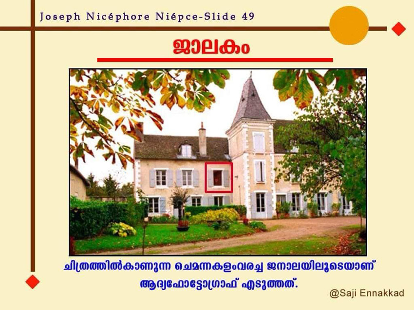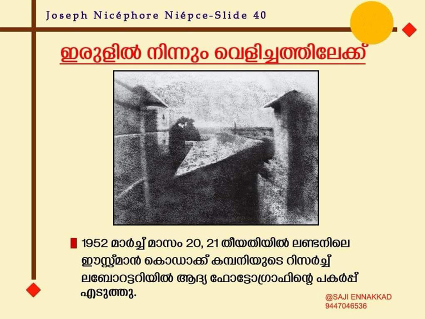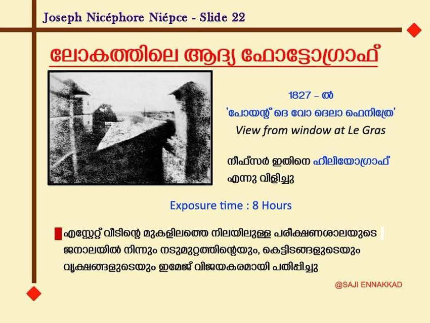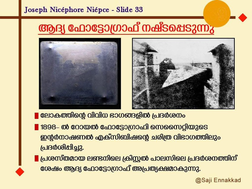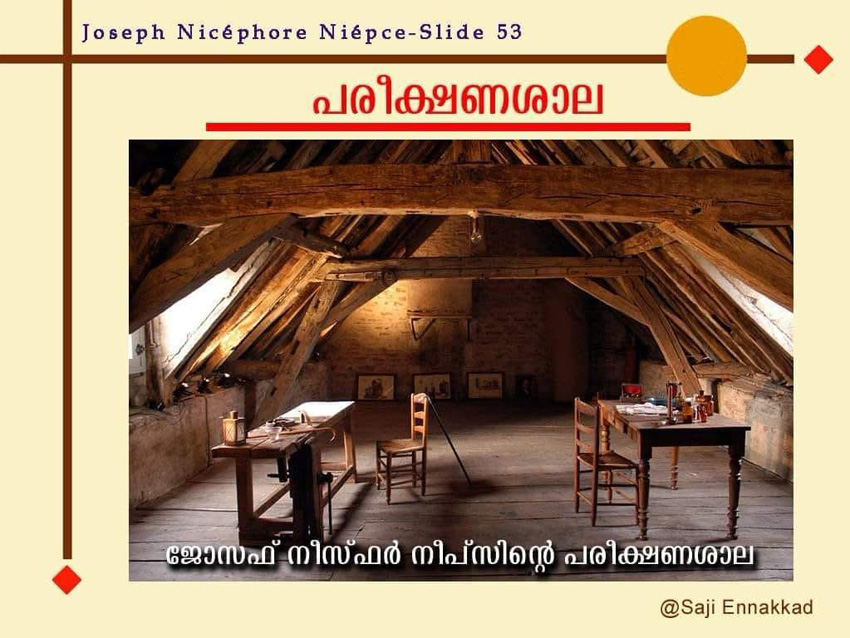 “Monsieur Niépce’s First successful experiment of fixing permanently the image from Nature.”