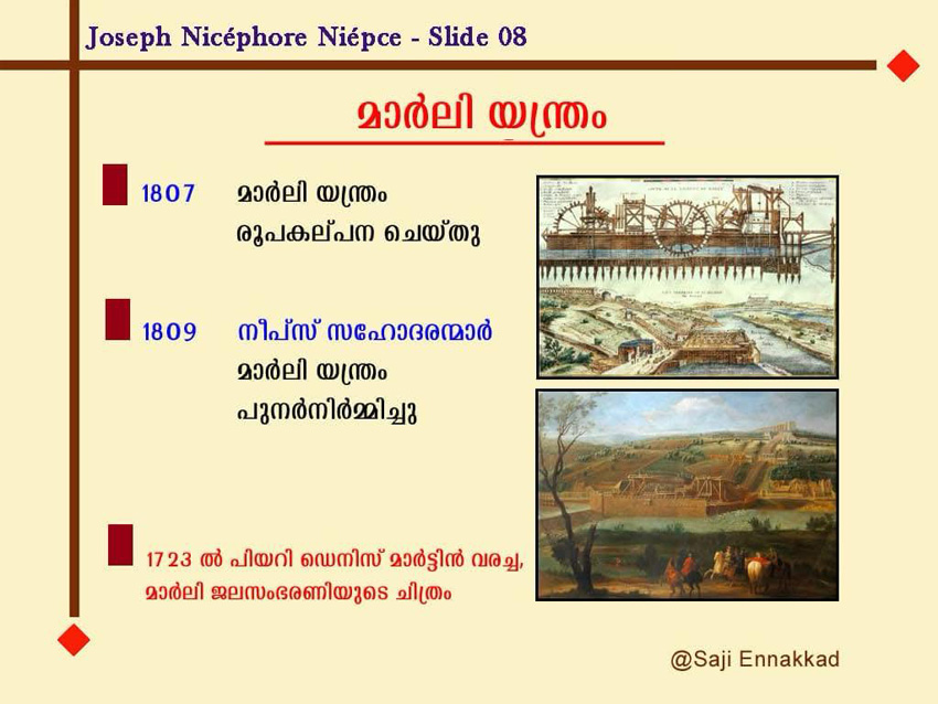 In 1807, the King decided to hold a competition to redesign and modernize the hydraulic machine. Joseph Nicéphore Niépce and his elder brother Claude Niépce participated in this competition.